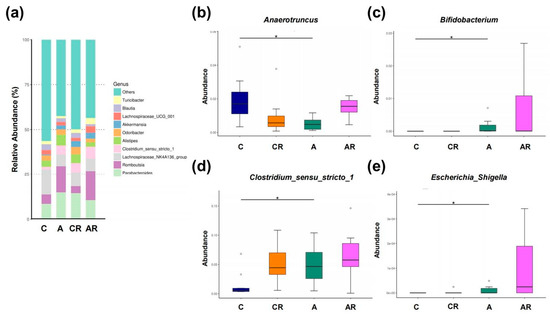 We next applied the LEfSe algorithm to identify statistically significant biomarkers among the groups, as depicted in Figure 9. According to LEfSe analysis, a lower abundance of genera Actinobacteria, Bifidobacterium, Verrucomicrobiae, Clostridium_sensu_stricto_1 and Bacteroidiabut and a greater Anaerotruncus abundance in the A group than in C group were detected (Figure 8a). Resveratrol intervention resulted in a higher Anaerotruncus abundance in the AR group than in the A group, and lower Bacteroidia abundance in the A group than in the AR group (Figure 8b).