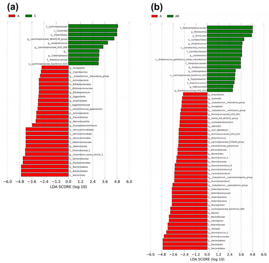 Gut microbiota composition in LEfSe. Linear discriminant analysis effect size (LEfSe) was used for biomarker discovery. Most depleted and enriched bacterial taxa in the (a) A (red) vs. C (green) group and (b) A (red) vs. AR (green) group are shown. The threshold for the linear discriminant was set to 2. n = 10, each group.