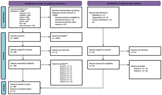 The initial search yielded 8142 records of which 89 articles underwent full-text evaluation, and 41 articles were selected and 48 were excluded (Table S1). Their selection was consistent with the researchers’ agreement [Kappa = 0.86; 95% CI, 0.66–1.0; (p < 0.001)]. It is noteworthy that in the search carried out in the grey literature, no study was found that met the inclusion criteria and mastery of the review after reading the full text (Figure 1).