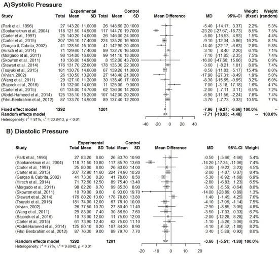 Regardless of the study design, there is a reduction in blood pressure when comparing the control/exposure and intervention groups. However, neither the study by Tobari et al. [59], a randomized clinical trial, or Erickson et al. [54], an observational study, have any evidence of improvement in blood pressure and the study by Robinson et al. [57], a non-randomized clinical trial, shows evidence of difference only for systolic pressure. Mean reductions in systolic (SBP) and diastolic blood pressure (DBP) are 6.8 and 3.7 for randomized clinical trials, 17.3 and 10.2 for non-randomized clinical trials, and 3.9 and 0.6 for observational studies, respectively (Table 6).