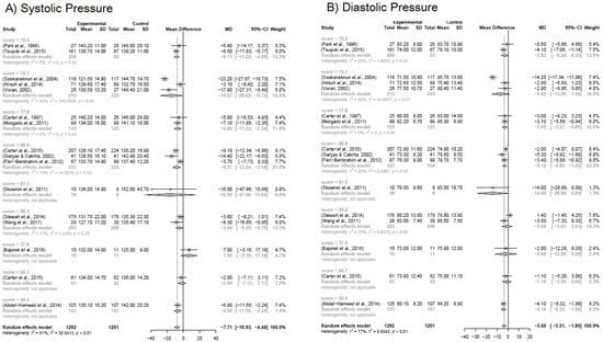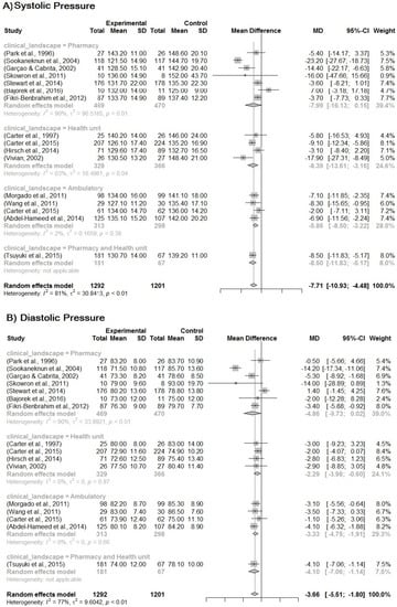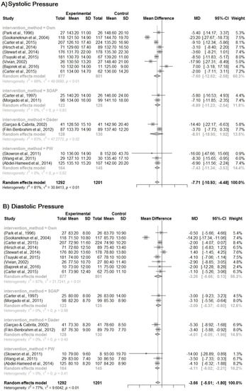 (A) Forest plot for systemic blood pressure. (B) Forest plot for diastolic blood pressure Forest plot of blood pressure reduction in the subgroup analysis for the MTM-PC insertion scenario. Included studies: Park et al. [23]; Sookaneknun et al. [24]; Garçao, Cabrita [34]; Skowron, Polak, Brandys [42]; Stewart et al. [43]; Bajorek et al. [48]; Fikri-Benbrahim et al. [52]; Carter et al. [29]; Carter et al. [30]; Hirsch et al. [35]; Vivian [46]; Morgado, Rolo, Castelo-Branco [39]; Wang et al. [47]; Carter et al. [49]; Abdel-Hameed et al. [51]; Tsuyuki et al. [45].