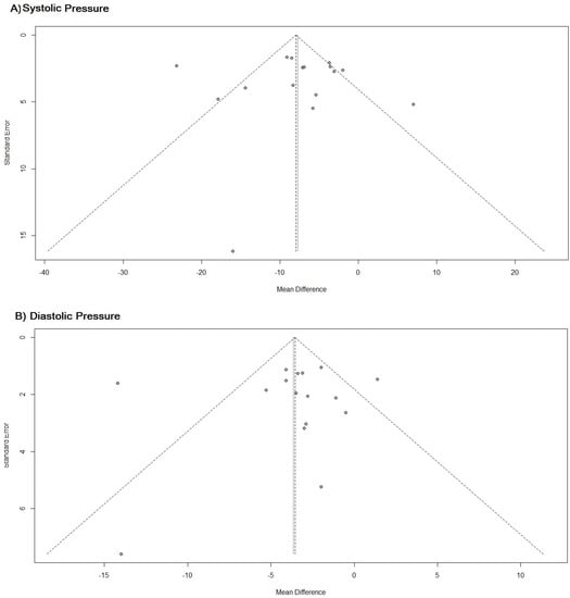 (A) Funnel chart for systemic blood pressure. (B) Funnel plot for diastolic blood pressure. Funnel plot of studies on the impact of MTM by PC on blood pressure in hypertensive patients.