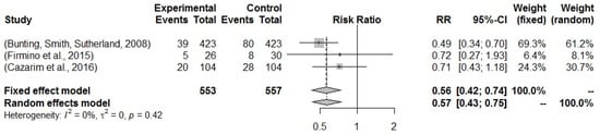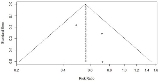 Relative risk was analyzed for cardiovascular risk over ten years, as measured by the ASCVD risk scale. It was only possible to calculate the risk in three studies. The results show that there is a reduction in the cardiovascular risk of hypertensive patients when there is MTM by PC for hypertensive patients. In this sense, the PC works as a protective factor when analyzed both by the fixed model and by the random model, relative risk (RR) = 0.561 (95% CI 0.422–0.742) and RR = 0.570 (95% CI 0.431–0.750). Although the studies can be considered homogeneous, I² = 0%, it makes no sense to state this possibility, due to the smaller number of studies for the calculation of “n” in the I² formula (Figure 7).