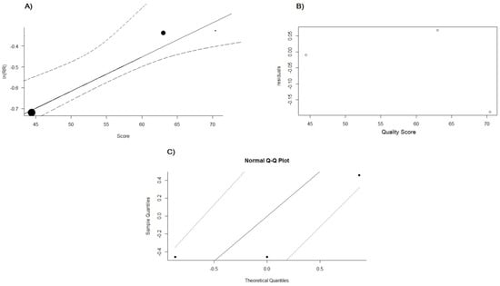 (A) Meta-plot for cardiovascular risk and study quality score. (B) Meta-regression graph for cardiovascular risk and study quality score. (C) Normal Q–Q plot meta-regression for cardiovascular risk and study quality score. Meta-regression for mixed-effects models for cardiovascular risk and the quality score of studies referring to MTM by PC for hypertensive patients.