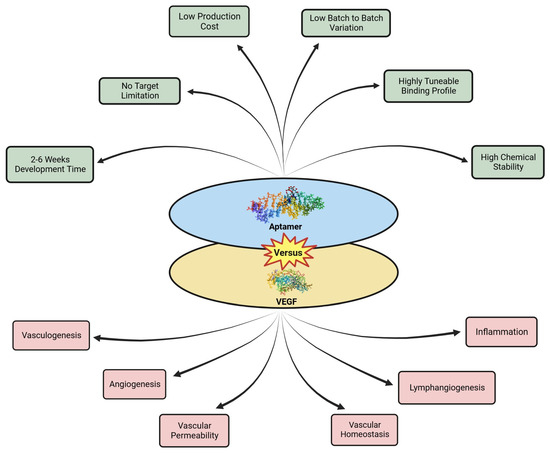 Aptamers have a lot of potential for the creation of anti-VEGF treatments. These chemical antibodies are single-stranded oligonucleotide sequences that can bind to their targets through three-dimensional (3D) folding. They are screened by Systematic Evolution of Ligands by Exponential Enrichment (SELEX) technology for superior affinity, specificity, and targeting. Because of their distinct properties, such as simple synthesis, small size, easy modification, low molecular weight, low manufacturing cost, high thermal stability, convenient storage and transportation, low immunogenicity and toxicity, and lack of inter-batch variability, aptamers have a broad range of potential therapeutic applications [18]. Hence, by identifying the OC biomarker VEGF on the tumor cell surface and/or in the serum, new aptamers constitute intriguing platforms for precise OC detection [19].