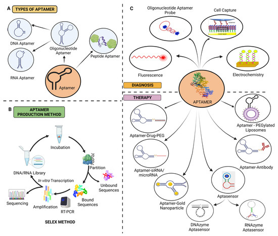 (A) Classification of aptamers, (B) schematic illustration of the SELEX technique, and (C) aptamers in ovarian cancer diagnosis and treatment [18,51,91].