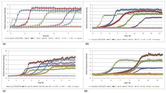 Plots of the relative fluorescence intensity of (a) Salmonella enterica ATCC 13076, (b) Staphylococcus aureus ATCC 6538, (c) Escherichia coli ATCC 8739, and (d) Bacillus subtilis ATCC 6633 cultures against time for different concentrations of DMSO (%).