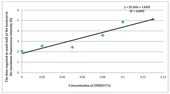 Figure 2 presents the linear dependence of the culture-specific parameter against the DMSO concentration. It can be seen that with the increasing DMSO concentration in the suspension of bacteria, the time it takes for the bacteria to reach half their fluorescence intensity is proportionally extended.