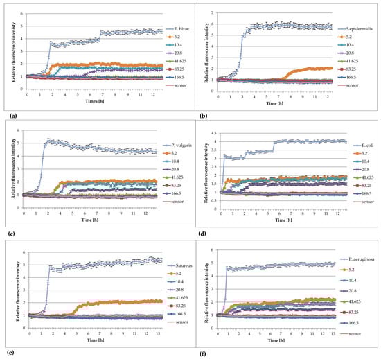 Plots of the relative fluorescence intensity of bacteria culture against time for different concentrations of extracts from Lonicera caerulea var. edulis ‘Wojtek’ fruits. Data presented in the legend contain concentrations of plant extracts (166, 83.25, 41.625, 20.8, 10.4, 5.2 mg/mL). (a) Enterococcus hirae ATCC 10541, (b) Staphylococcus epidermidis ATCC 14990, (c) Proteus vulgaris NCTC 4635, (d) Escherichia coli ATCC 8739, (e) Staphylococcus aureus ATCC 6538, (f) Pseudomonas aeruginosa ATCC 9027.
