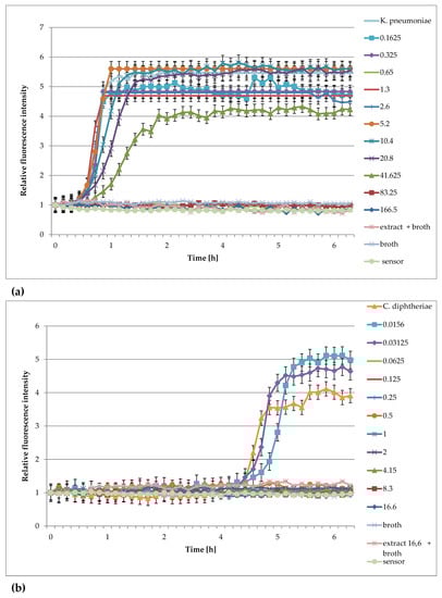 Plots of the relative fluorescence intensity of bacteria culture against time for different concentrations of extracts from Rubus idaeus shoots (166, 83.25, 41.625, 20.8, 10.4, 5.2 mg/mL or 16.6, 8.3, 4.15, 2.075, 1, 0.6 mg/mL). (a) Klebsiella pneumoniae, (b) Corynebacterium diphtheriae.