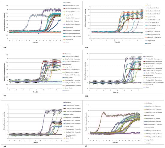 Plots of the relative fluorescence intensity of microorganism cultures against time for different concentrations of syrups: DexaPico, Gardlox, and the ear drops Ototalgin. Data presented in the legend contain dilution of non-sterile pharmaceutical products (1:10; 1:100; 1:1000). (a) Staphylococcus aureus ATCC 6538, (b) Escherichia coli ATCC 8739, (c) Salmonella enterica ATCC 13076, (d) Pseudomonas aeruginosa ATCC 9027, (e) Bacillus subtilis ATCC 6633, (f) Candida albicans ATCC 10231.