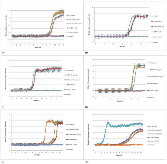 Plots of the relative fluorescence intensity of microorganism cultures against time for 1:10 dilution of Injection Natrii Chlorati Isotonica (INCI) and the eye drops Polcrom in culture. (a) Staphylococcus aureus ATCC 6538, (b) Escherichia coli ATCC8739, (c) Salmonella enterica ATCC 13076, (d) Pseudomonas aeruginosa ATCC 9027, (e) Bacillus subtilis ATCC 6633, (f) Candida albicans ATCC 10231.