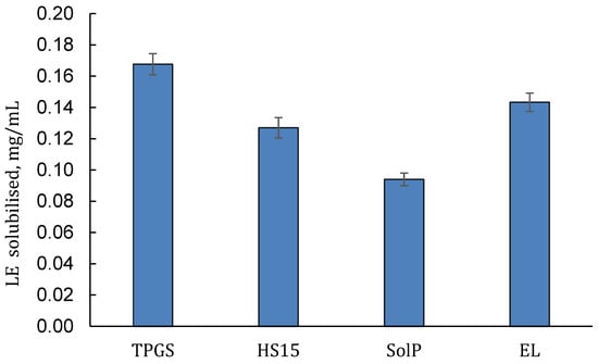 Solubility of LE in presence of 5.0% w/w of different polymeric surfactants (Isodel® Vitamin E TPGS 1000 (TPGS), Kolliphor® HS-15 (HS), Soluplus® (SolP) and Kolliphor®-EL (EL)) (mean ± SD, n = 3).