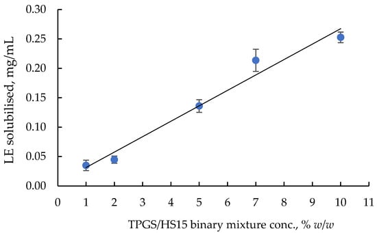 The results are summarised in Figure 2 where LE-In for different concentrations of TPGS/HS binary mixture in a (1:1) weighted ratio is reported. A quite linear correlation is evidenced by the experimental points with a tendency to reach a plateau for the highest concentration of the polymeric surfactant. However, statistically significant differences in LE-In between 7.0% and 10% w/w concentrations of the (1:1) TPGS/HS binary mixture (p < 0.05, t-test unpaired analysis) were observed. Probably, this positive effect on the solubility, rather than being due to the type of selected surfactant, could have been due to an interaction between the chains of these molecules with a probable synergism.