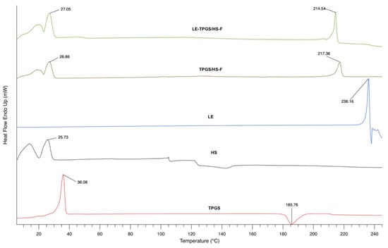 The results from the physico-chemical characterisation of the LE-TPGS/HS nanomicelles via DSC are in Figure 3, where the thermograms of the freeze-dried selected nanomicelles (LE-TPGS/HS-F and TPGS/HS-F) are reported with those of each polymeric surfactant and of the pure drug.