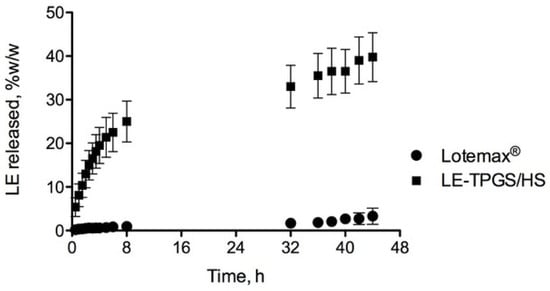 More than 20% of LE was released from LE-TPGS/HS within the first 5 h in the PBS buffer, while a very low percentage of the drug was found in the case of the commercial-suspension Lotemax™ eye drops (0.5% LE). Despite the scarce aqueous solubility of LE, the nanomicellar carrier favoured its solubilisation, sustaining its release in the dissolution medium for several hours with about 40% of LE being detected after 48 h. The dissolution profile seems to be a typical diffusive profile similar to those obtained for other nanomicellar systems encapsulating insoluble drugs [].