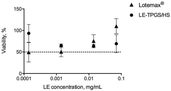 The results of the cytotoxicity study, which was aimed at highlighting any possible toxicity of the polymeric surfactants, are displayed in Figure 5, where the percentage of cell viability, measured for both LE-TPGS/HS and the Lotemax™ eye drop, is reported as a function of the concentration of LE, that represents the common ingredient. The treatment of RCE with Lotemax™ showed slight cytotoxicity, albeit with a high experimental viability, by reducing the LE concentration. In any case, cell viability remained above 50% for all the tested concentrations.