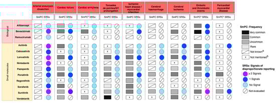 Arterial aneurysm/aortic dissection was the most studied cardiovascular AE in SRS studies. However, the frequency of these reactions is not known in the SmPCs for all drugs evaluated, except for pazopanib (rare). Large pharmacoepidemiology studies are warranted to clarify this aspect.
