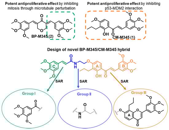 Chalcones, as well as their analogues, diarylpentanoids, have gained high recognition among medicinal chemists due to their wide range of pharmacological potential [1,2,3,4,5]. The antitumor activities of these compounds have been recognized through their interference with several biological targets [6,7,8,9]. Our research group has reported several chalcones and diarylpentanoids with notable growth inhibitory activity in human tumor cell lines [10,11,12,13,14,15]. Particularly, chalcone CM-M345 (1, Figure 1) showed potent antiproliferative activity (2.1 ≤ GI50 ≤ 3.4 μM) in a panel of human tumor cell lines (breast adenocarcinoma MCF-7, non-small cell lung cancer NCI-H460, gastric adenocarcinoma AGS, and colorectal cancer HCT116). It also behaved as an inhibitor of the interaction between the tumor suppressor protein p53 and its negative endogenous regulator, MDM2, in yeast-based assays [16]. More recently, the diarylpentanoid BP-M345 (2, Figure 1) also displayed a potent growth inhibitory effect (0.17 ≤ GI50 ≤ 0.45 μM) on MCF-7 and NCI-H460 cells, as well as on melanoma (A375-C5), showing low cytotoxicity in non-tumor cell lines (fibroblasts, HFF-1, and pulmonary alveolar epithelial HPAEpiC cells) [12,17]. A study of the mechanisms involved in the antiproliferative effect of BP-M345 revealed that this compound exerts its antiproliferative activity by inhibiting mitosis through microtubule perturbation and cell death induction [17]. Docking studies in the binding site of α,β-tubulin (PDB: 4O2B [18]) suggested that BP-M345 occupies the colchicine binding site of α,β-tubulin, with one of its 3,4,5-trimethoxyphenyl groups having the same position as the trimethoxyphenyl group (A-ring) of colchicine [17]. These results were in accordance to what was expected, since the presence of a 3,4,5-trimethoxyphenyl group in some microtubule-targeting agents (MTAs), such as colchicine, combretastatin A4, and podophyllotoxin, has been considered as being important for the interaction with tubulin [19].