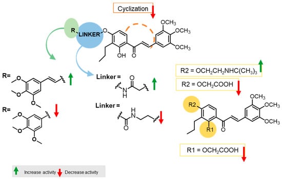 The synthesis of another chalcone-trimethoxyphenylamide hybrid, 13 (an analogue of Group II), resulting from the isosteric substitution of the amide linker by a retro-amide, was conducted using a three-steps pathway (Scheme 1C). Firstly, methyl 2-(4-acetyl-3-hydroxy-2-propylphenoxy)acetate (9) was synthetized via a nucleophilic substitution reaction of 1-(2,4-dihydroxy-3-propylphenyl)ethan-1-one with methyl bromoacetate in the presence of K2CO3 and anhydrous acetone as a solvent with 45% yield. The compound dimethyl 2,2’-((4-acetyl-2-propyl-1,3-phenylene)bis(oxy))diacetate (10) was also obtained as a by-product of the reaction in 25% yield. This reaction was followed by an aldol condensation between each synthesized acetophenone (9 or 10) with 3,4,5-trimethoxybenzaldehyde. In these cases, the aldol condensation reaction in basic medium also allowed for the hydrolysis of the ester group to obtain (E)-2-(3-hydroxy-2-propyl-4-(3-(3,4,5-trimethoxyphenyl)acryloyl)phenoxy)acetic acid (11) and (E)-2,2’-((2-propyl-4-(3-(3,4,5-trimethoxyphenyl)acryloyl)-1,3-phenylene)bis(oxy))diacetic acid (12), respectively, with moderate yields (30% and 35%, respectively). Lastly, chalcone 11 gave rise to hybrid 13 through the reaction with 3,4,5-trimethoxyaniline in the presence of the coupling reagent COMU, with 30% yield.