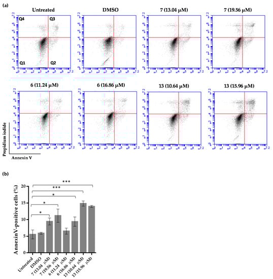 Treatment with 6, 7, and 13 induces apoptotic tumor cell death. (a) Representative flow cytometry histogram of propidium iodide (PI) and Annexin V (FITC-A) staining in untreated cells and tumor cells treated with 6, 7, and 13 at the indicated concentrations, for 48 h. DMSO was used as a control. The quadrants Q were defined as Q1 = live cells (Annexin V-negative/PI-negative), Q2 = early stage of apoptosis (Annexin V-positive/PI-negative), Q3 = late stage of apoptosis (Annexin V-positive/PI-positive) and Q4 = necrosis (Annexin V-negative/PI-positive). (b) Quantification of Annexin V-positive cells (early and late apoptosis) from the data shown in (a). * p < 0.05 and *** p < 0.001 via unpaired t-test from three independent experiments.