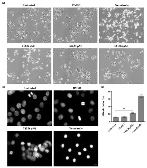 A total of 1.2 × 105 HCT-116 cells were grown in six-well dishes and treated for 24 h with 3.26 µM of compound 7. Cells treated with 1 µM nocodazole were used as a positive control for antimitotic activity. Untreated cells and cells treated with DMSO were included to exclude the cytotoxicity of the compound solvent. Mitotic index, and the percentage of mitotic cells over the total cell population were determined via cell-rounding under phase-contrast microscopy from at least ten random microscope fields.