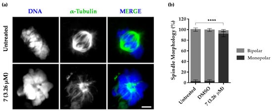 To understand the mechanism behind the induction of mitotic arrest after treatment with the compound 7, we treated HCT116 cells with the GI50 of the compound. Twenty-four hours later, we performed an immunofluorescence assay using an anti-α-tubulin antibody to visualize the spindle morphology. Under fluorescence microscopy, we observed that most compound 7-treated cells showed collapsed mitotic spindles (91.41 ± 4.87%), contrasting with untreated or DMSO-treated cells (2.20 ± 3.13% and 2.86 ± 2.85%, respectively) (Figure 5). Likewise, the percentage of bipolar spindles (the normal morphology of a mitotic spindle) found in compound 7-treated cells (6.57 ± 2.13%) was significantly lower than in untreated or DMSO-treated cells (97.80 ± 3.13% and 96.43 ± 2.72%, respectively) (Figure 5). This finding indicates that compound 7 induces mitotic delay by interfering with mitotic spindle assembly by generating monopolar-like spindles.