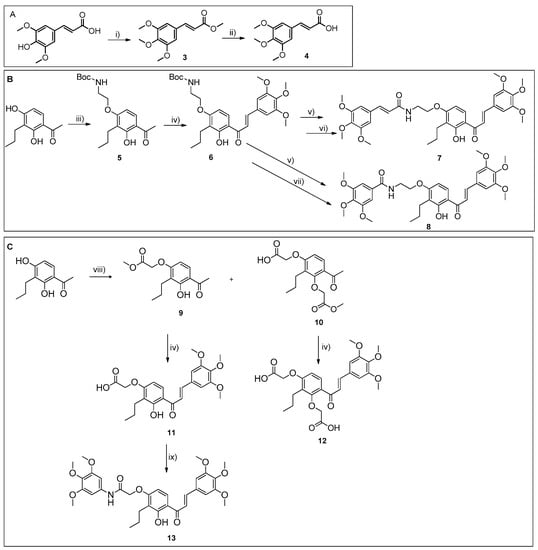 General procedure for the synthesis of chalcone-trimethoxycinnamide (7) and chalcone-trimethoxyphenylamide (8 and 13) hybrids. (A) Synthesis of 3,4,5-trimethoxycinnamnic acid (4); (B) Synthesis of chalcone-trimethoxycinnamide (7) and chalcone-trimethoxyphenylamide (8) hybrids; (C) Synthesis of chalcone-trimethoxyphenylamide hybrid (13). Reaction conditions: (i) (CH3)2SO2, K2CO3, anhydrous acetone, 65 °C; (ii) HCl:H2O, THF, 70 °C; (iii) anhydrous acetone, K2CO3, 2-(Boc-amino)ethyl bromide; (iv) 3,4,5-trimethoxybenzaldehyde, NaOH, MeOH; (v) TFA; (vi) Hünig’s base, COMU, (E)-3-(3,4,5- trimethoxyphenyl)acrylic acid (4); (vii) 3,4,5-trimethoxybenzoic acid, Hünig’s base, COMU; (viii) anhydrous acetone, K2CO3, methyl bromoacetate; (ix) 3,4,5-trimethoxyaniline, Hünig’s base, COMU.
