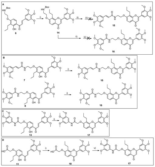 General procedure for the synthesis of flavone-trimethoxycinnamide (15) and flavone-trimethoxyphenylamide (16 and 17) hybrids. (A) Method A for the synthesis of flavone-trimethoxycinnamide (15) and flavone-trimethoxyphenylamide (16) hybrids. (B) Method B for the synthesis of flavone-trimethoxycinnamide (15) and flavone-trimethoxyphenylamide (16) hybrids. (C) Method A for the synthesis of flavone-trimethoxyphenylamide hybrid (17). (D) Method B for the synthesis of flavone-trimethoxyphenylamide hybrid (17). Reaction conditions: (i) I2 (cat.), DMSO, reflux, N2; (ii) TFA; (iii) 3,4,5-trimethoxycinnamic acid, Hünig’s base, COMU; (v) 3,4,5-trimethoxyaniline, Hünig’s base, COMU.