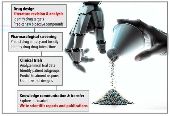 As discussed in previous sections, AI has the potential to play a crucial role in the various stages of drug discovery, ranging from drug design to the final market introduction (Figure 1). However, the impact of AI extends beyond these areas and can greatly benefit the processing and analysis of scientific literature. Integrating AI into a literature review and article writing in the field of drug design holds immense promise. AI algorithms can expedite the review process, provide comprehensive insights from diverse data sources, and assist in identifying new research avenues. Additionally, AI-powered writing tools can enhance the quality and efficiency of scientific writing, enabling researchers to effectively communicate their findings. By embracing AI technologies in these domains, we not only save time and resources but also enhance the overall quality of drug design research, bringing us closer to the development of innovative and life-changing therapies.