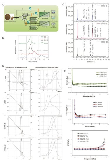 (A) Separation of crude polysaccharides by ultrafiltration membrane. (B) Elution curve (C) monosaccharide composition (D) and molecular weight of CPPS-I, II, and III purified by Sephadex G-100. (E) Rheological properties of polysaccharides.