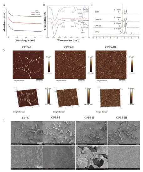 (A) UV, (B) Infrared, (C) NMR spectroscopy, (D) AFM, (E) SEM images of CPPS-I, CPPS-II, and CPPS-III.