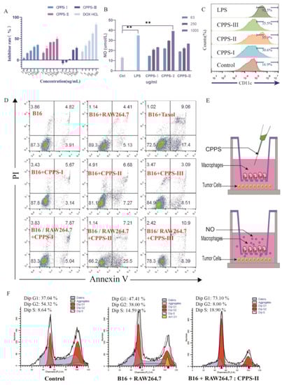 (A) Tumor inhibition rate of different Codonopsis polysaccharides and (B) NO production of every group by RAW264.7 cells. (C)Effects on macrophage polarization. (D) Flow cytometry analysis of apoptosis induced by CPPS in B16 cells using Annexin V-FITC staining. (E) Raw264.6 and B16 cells co-culture diagram. (F) Cell cycle distribution by flow cytometry of B16 cells.** p < 0.01.