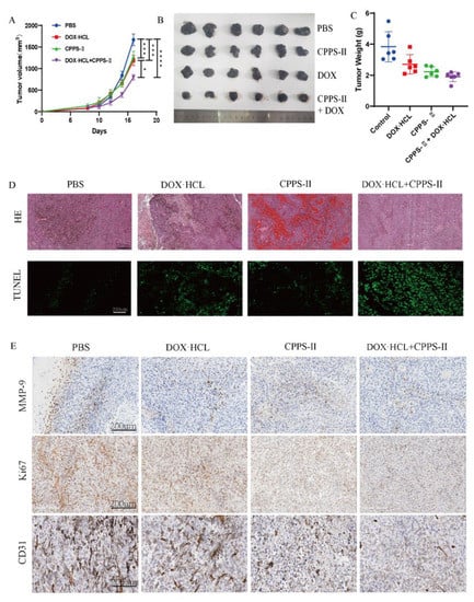 Ki67 is a nuclear protein that could indicate cell proliferation activity; the Ki 67-positive tumor cells are often correlated with the clinical course of cancer. As shown in Figure 4E, the control group demonstrated a stronger positive expression. In contrast, all other groups showed a weaker yellow color after administration, indicating that the cell proliferation activity was weakened. Subsequently, the expression of other markers, CD31 and MMP9, was used to demonstrate the degree of tumor angiogenesis and metastasis, respectively. As shown in Figure 4E, the co-treatment group significantly downregulated the CD31 and MMP9 expression in the tumor tissues when compared to the DOX or CPPS-II treatment groups individually.