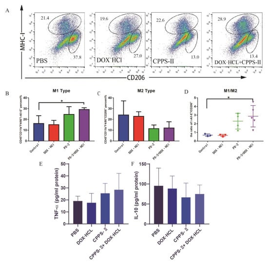 The intratumoral infiltration of TAMs (CD45 + CD11b + F4/80+) was measured to reflect the impact of different treatment groups on the tumor immune environment. However, TAMs are heterogeneous immune cells that have been historically categorized into two groups, as follows: M1 (MHC-I) and M2 (CD206). M1 macrophages play an important role in proinflammatory and cytotoxic (anti-tumoral) functions, whereas M2-TAMs refer to anti-inflammatory and tissue healing (pro-tumoral) functions. Both the subtypes of TAMs were analyzed by flow cytometry and immunofluorescence staining. As shown in Figure 5A–D, the frequency of M2-TAMs after polysaccharide treatment alone and co-treatment were distinctly lower than that in the saline group and DOX group individually. Meanwhile, the number of M1-TAMs treated with CPPS-II and CPPS-II + DOX was the highest among all groups.