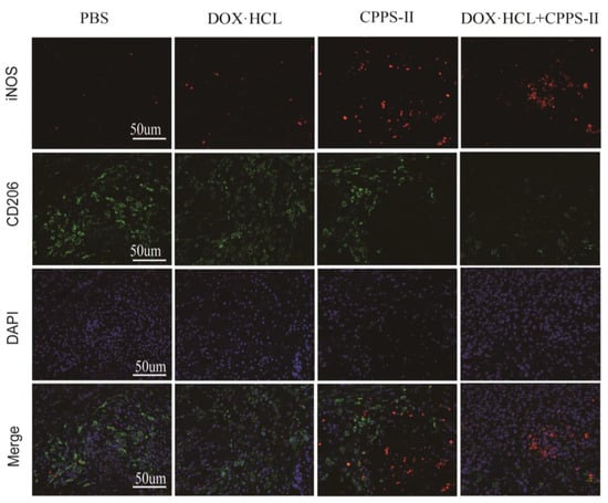 Fluorescence microscopy observations confirmed a decrease in the expression of M2 (CD206 marker) in tissue macrophages after administration via CPPS-II (Figure 6A); the expression of iNOS was increased. This finding is consistent with the flow cytometry data, which suggests that CPPS-II can modify the tumor microenvironment by repolarizing M2 TAMs to M1 TAMs. The increased expression of iNOS produced nitric oxide (NO) to achieve the tumor-killing effect, indicating that CPPS-II has a good regulatory effect on TAMs [27].