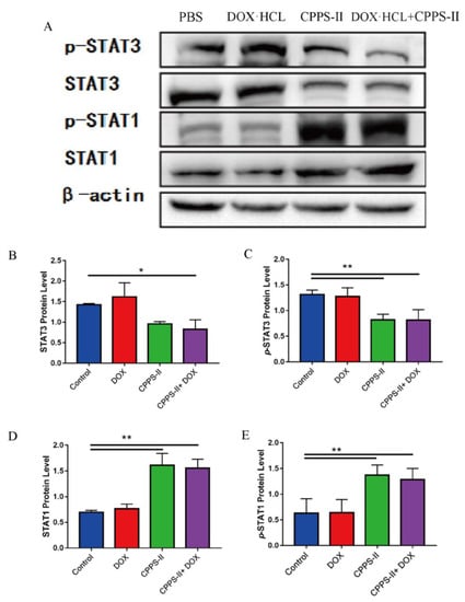 To further investigate the underlying mechanism of co-treatment therapy, we examined several major downstream signaling molecules of tyrosine kinases, including Stat1 and Stat3, in tumor tissues isolated at the end of the pharmacodynamic assay. The results demonstrated that CPPS-II monotherapy significantly decreased the p-Stat3 and Stat3 protein levels compared to the saline and DOX groups (Figure 7A–C). Moreover, the expression of p-Stat3 and Stat3 after CPPS-II + DOX treatment remained unchanged relative to that after CPPS-II treatment alone. The abnormally high levels of Stat3 activity have been associated with an increased likelihood of melanoma returning after treatment. The activation of Stat3 promoted cell division and reduced cell apoptosis, and the inhibition of p-Stat3 inhibited tumor growth by inducing tumor cell apoptosis [28], increasing dendritic cell activation, reducing tumor Treg and CD8+ T-cell activation, and decreasing the accumulation of MDSCs. We also measured the p-Stat1 and Stat1 protein expression increase after treatment with CPPS-II and CPPS-II + DOX. The activation of Stat1 could enhance the ability of M1-polarized macrophages and elevate the production of proinflammatory cytokines [29] (Figure 7D,E). Therefore, together with the results discussed above, CPAP may drive M2-type macrophage polarization by promoting Stat1 phosphorylation and inhibiting Stat3 activation. The original western data were displayed in Figures S2–S6.