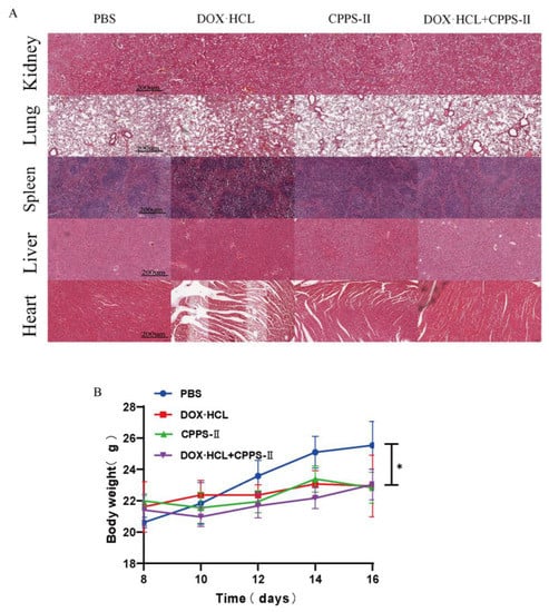 Safety testing of drugs. (A) H&E staining of heart, liver, spleen, lung, and kidney tissues of mice in each experimental group after 16 days of treatment. (B) The variation curves of body weight during the therapy period. * p < 0.05.