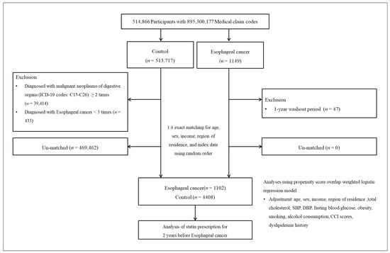 A schematic illustration of the participant selection process used in the present study. Of a total of 514,866 participants, 1102 esophageal cancer participants were matched with 4408 control participants for age, sex, income, and region of residence.