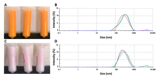 | Macroscopic aspect | Intense orange-coloured, turbid, milky liquid, homogeneous | Intense orange-coloured, turbid, milky liquid homogeneous | Weaker colour, turbid, creamy, phase separation |