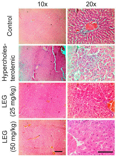 2.3. Effect of LEG on Liver Function and Histopathological Parameters of Hypercholesterolemic Hamsters
