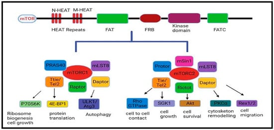 The mammalian target of rapamycin or mechanistic target of rapamycin (mTOR) is a serine–threonine protein kinase that modulates cellular metabolism, growth, cell proliferation or survival and gene expression phenomena [1]. Structurally, mTOR is a 289-kDa protein that is expressed in almost all the tissues of the body [2]. The phosphorylation of mTOR is triggered at particular residues (S1261, T2446, S2448, S2481) in response to growth factors, mitogens, hormones, and nutrition, whereas a lack of these factors and oxygen can inhibit its activation and enzymatic activity [3]. There are two complexes of mTOR, mTORC1 and mTORC2, which are physically and functionally distinct. While mTORC1 is comprised of mTOR, GβL (positive regulator of mTOR, which increases the kinase activity of mTOR), deptor, and raptor, mTORC2 is comprised of rictor, mTOR, proline rich 5 (PPR5), GβL, deptor and SIN1 (Figure 1). The role of various components of this signalling pathway is summarized briefly in Table 1 [4]. mTOR is linked to many signalling cascades, including phosphoinositide 3-kinase/Protein kinase-B, also known as Akt (PI3K/Akt), LKB1 (Liver kinase B-1/adenosine 5′-monophosphate-activated protein kinase (AMPK), tuberous sclerosis complex subunit 1 TSC1/TSC2/Ras homolog enriched in brain (Rheb), and Vam6/Rag GTPases [5]. It regulates cell proliferation, apoptosis, and autophagy (autophagic cell death) pathways by influencing various key processes like transcription and protein synthesis by integrating diverse signalling stimuli [6].