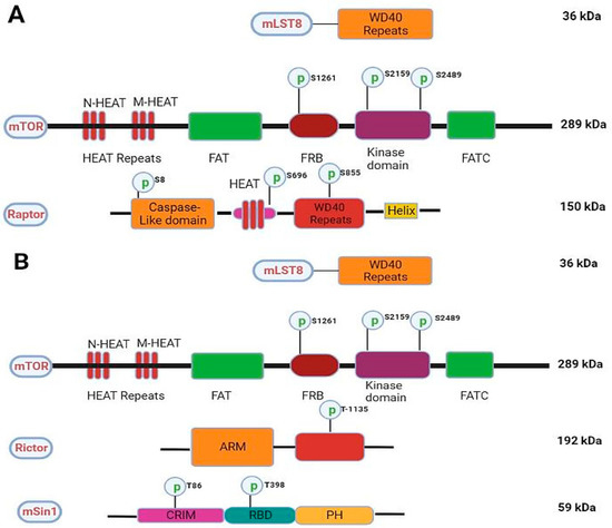 Schematics of the mTORC1 and mTORC2. (A) showing various domains, phosphorylation sites, and molecular weights in key components of mTORC1. (B) showing various domains, phosphorylation sites, and molecular weights in key components of mTORC2.