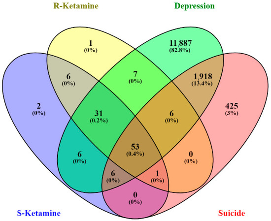In this study, we used some of these bioinformatics tools to investigate the potential molecular targets of ketamine enantiomers in depression and suicide. Ketamine has been reported to exhibit polypharmacological action, and there may be differences between esketamine and arketamine in terms of their potency and biological effects, which may be due to their ability to interact with different molecular targets [20,21]. Therefore, we also computationally investigated the overlapping and/or unique molecular targets of esketamine and arketamine in depression.