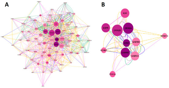 The search for the ketamine enantiomers, suicide, and depression overlapping genes in Homo sapiens was performed in GeneMANIA. The obtained network was imported and analyzed in Cytoscape V. 3.9.1. software (The Cytoscape Consortium, San Diego, CA, USA). As a result, a network with 73 nodes, 891 connections, and a clustering coefficient equal to 0.349 was obtained. The colors of the edges (connections) reflected the type of interaction analyzed. The network had 891 connections, of which 34.85% were physical interactions (green), 28.20% were co-expressed (yellow), 25.94% represented shared protein domains (pink), 9.09% were co-localized (blue), 7.20% were predictions (gray), 2.84% were genetic interactions (purple), and 1.88% were metabolic pathways (black). The network construction of esketamine, arketamine, suicide, and depression overlapping genes is shown in Figure 2A. Regarding the network organized in Cytoscape software, the larger the size of the node, the higher the degree (n° of connections) of a given protein, and the darker the color, the higher the betweenness centrality (importance of that protein as a “bridge” or shortest pathway in the network). When we built the network with 53 overlapping genes, 20 genes were retrieved in the network, namely KCNN4, NQO1, AOC2, VEGFD, VEGFC, CA3, AOC1, CA12, GABRA3, PDE5A, MTNR1B, GABRB2, CA13, GRIN2C, CA8, GABRA6, GABRA4, GRIN3A, PDE4B, and PDE3B. Subsequently, the network was filtered considering degree > 30 and betweenness centrality between 0.017 and 0.044. From these data, 11 genes were found to have the highest number of connections (Degree > 30) and the shortest paths (betweenness centrality) in the network. The genes found were GRIN2B, GRIN2A, GRM4, EGFR, KDR, GABRB3, GABRB2, GABRA3, KCNN1, PDE5A, and MTNR1B. The proteins encoding for these genes were as follows: NMDA receptor (GRIN2B and GRIN2A), metabotropic glutamate receptor (GRM4), GABA receptor subunits β2, β3 and α3 subunits (GABRB3, GABRB2, GABRA3), epithelial growth factor receptor (EGFR), melatonin receptor 1β (MTNR1B), kinase insertion domain receptor (KDR), member 1 of the N subfamily of calcium-potassium activated channel (KCNN1), and the enzyme phosphodiesterase 5A (PDE5). The filtered network of the targets obtained is illustrated in Figure 2B.