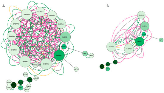 In the second step of the network analysis, we obtained potential targets shared by esketamine, suicide, and depression. Therefore, the green diagram was built by searching for the genes SIRT1, PIK3CA, I-CAM1, GABRA1, GABRB2, and PRF1. As a result, we obtained a network with 26 nodes, 242 connections, and a clustering coefficient equal to 0.714. Figure 3A shows a high degree of clustering among the genes encoding GABAergic receptor subunits, which were more connected to each other than to other genes. Most interactions were physical interactions (48.92%), followed by predicted interactions (37.4%), co-expression (10.2%), and shared protein domains (3.48%). In the network construction, we retrieved 20 genes. After applying degree (DC > 2) and betweenness centrality (BC) filters between 0.012 and 0.0667, we obtained the 11 most important genes in the network, as illustrated in Figure 3B. Most of these genes encoded GABAergic receptor subunits (GABRA1, GABRB1, GABRA4, GABRG2, GABRB2), but genes encoding sirtuin 1 (SIRT1), integrin subunit alpha L (ITGAL), phosphatase (FOSPI3K) and kinase (PI3K) subunits, thrombopoietin receptor (MPL), transcription factor (BCL11A), and perforin 1 (PRF1) were also identified.