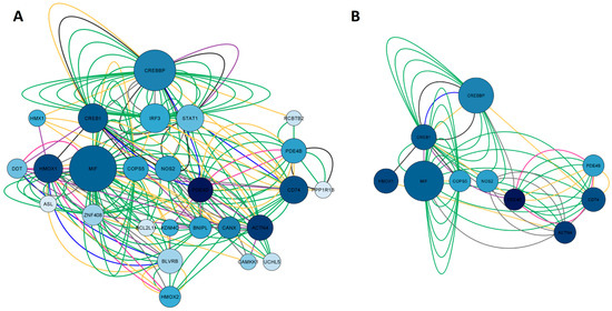 The third network, represented in Figure 4A, whose nodes are in blue, represented the common targets between arketamine, depression, and suicide and was assembled based on the search for the genes CREBBP, NOS2, HMOX1, KDM4C, PDE4B, and MIF. As a result, we obtained a network with 26 nodes, 189 connections, and a clustering coefficient equal to 0.293. When we performed the pharmacological network analysis of only esketamine, the result was a cluster of GABAA receptors (with a clustering coefficient equal to 0.714, where the closer to 1, the less random the nodes of a network were involved), highlighting the genes coding for some specific subunits, such as GABRA1, GABRA4, GABRB1, GABR2, and GABRG2. Most interactions were physical interactions (80.30%), followed by predicted interactions (9.48%), genetic interactions (4.28%), co-expression (3.72%), metabolic pathways (1.12%), co-localization (0.74%), and shared protein domains (0.37%). In the network construction, we retrieved 20 genes. After applying degree (DC > 16) and betweenness centrality (BC) filters between 0.039 and 0.157, we obtained the 10 most important genes of the arketamine, depression, and suicide network, as illustrated in Figure 4B. Most of these genes coded for signaling pathway-related proteins (CREB1, CREBBP, and COPS5), enzyme-related genes (PDE4B, PDE4D, NOS2, and HMOX1), genes related to immune responses (MIF and CD74), and cytoskeleton (ACTN4).