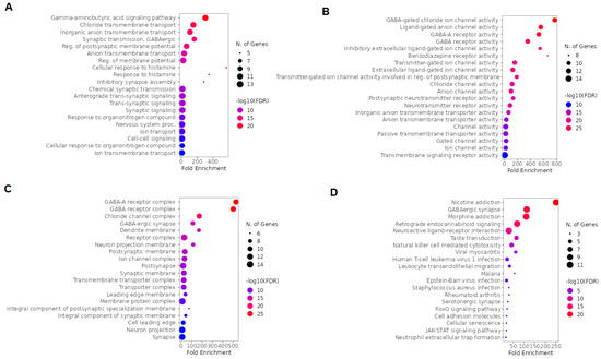 We used GO and KEGG for a global evaluation of ketamine enantiomers, suicide, and depression overlapping genes. According to biological process (BP) analysis of GO, the top five terms were chemical synaptic transmission, anterograde trans-synaptic signaling, trans-synaptic signaling, synaptic signaling, and regulation of membrane potential (Figure 6A). Furthermore, based on fold enrichment, the one-carbon metabolic process, GABAergic synaptic transmission, and the GABA signaling pathway were also highlighted in BP (Figure 6A). The results of molecular function (MF) describing the top five terms were transmitter-gated ion channel activity, extracellular ligand-gated ion channel activity, carbonate dehydratase activity, gated channel activity, and ligand-gated ion channel activity (Figure 6B). Moreover, based on fold enrichment, NMDA glutamate receptor activity and GABA-gated chloride ion channel activity were also highlighted in MF (Figure 6B). The top five cellular components (CC) included synapse, neuron projection, somatodendritic compartment, synaptic membrane, and receptor complex (Figure 6C). According to CC, it was also possible to verify the importance of these genes as components of GABA-A receptor complex, GABA receptor complex, and NMDA selective glutamate receptor complex (Figure 6C). The top five signaling pathways according to the KEGG enrichment analysis were morphine addiction, nicotine addiction, neuroactive ligand-receptor interaction, Rap1 signaling pathway, and cAMP signaling pathway (Figure 6D). Furthermore, cocaine addiction, amphetamine addiction, GABAergic synapse, glutamatergic synapse, and dopaminergic synapse were also involved in the function of these genes (Figure 6D).