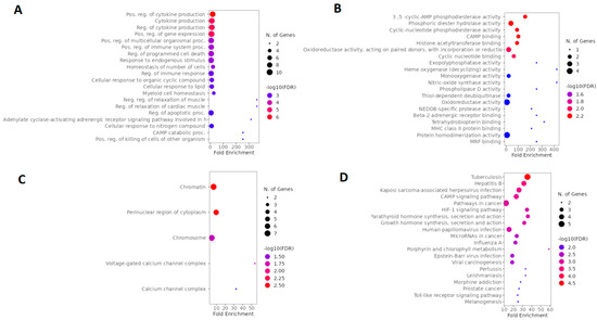 To investigate the biological functions and biochemical pathways involved in the action of arketamine in depression and suicide, GO and KEGG analyses were performed. According to BP, the top five terms were positive regulation of cytokine production, cytokine production, regulation of cytokine production, positive regulation of gene expression, and positive regulation of multicellular organism processes (Figure 8A). Additionally, based on fold enrichment, negative regulation of relaxation of muscle, regulation of relaxation of cardiac muscle, adenylate cyclase-activating adrenergic receptor signaling pathway involved in heart process, cAMP catabolic process, and positive regulation of killing of cells of another organism were highlighted in BP (Figure 8A). The MF top five terms were 3′,5′-cyclic-AMP phosphodiesterase activity, phosphoric diester hydrolase activity, cyclic-nucleotide phosphodiesterase activity, 3′,5′-cyclic-nucleotide phosphodiesterase activity, and cAMP binding (Figure 8B). Furthermore, heme oxygenase activity, nitric-oxide synthase activity, and tetrahydrobiopterin binding demonstrated a high fold enrichment in MF (Figure 8B). The only significant cellular localizations in CC were chromatin, perinuclear region of cytoplasm, chromosome, voltage-gated calcium channel complex, and calcium channel complex (Figure 8C). The top 5 pathways indicated by KEGG were tuberculosis, hepatitis B, Kaposi sarcoma-associated herpesvirus infection, cAMP signaling pathway, and pathways in cancer (Figure 8D). These pathways are related to genes and proteins that are important in the immune response against infections and cancer.