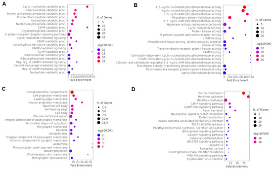 We used GO and KEGG for a global evaluation of overlapping ketamine enantiomers and depression genes. The top five BP terms were cyclic nucleotide catabolic process, ribonucleotide catabolic process, purine-containing compound catabolic process, purine ribonucleotide catabolic process, and cyclic nucleotide metabolic process (Figure 9A). Moreover, based on fold enrichment, the cAMP catabolic process and cGMP catabolic process were also highlighted in BP (Figure 9A). The MF top five terms were 3′,5′ -cyclic-nucleotide phosphodiesterase activity, cyclic-nucleotide phosphodiesterase activity, 3′,5′-cyclic-AMP phosphodiesterase activity, phosphoric diester hydrolase activity, and 3′,5′-cyclic-GMP phosphodiesterase activity (Figure 9B). The top five CC terms included somatodendritic compartment, cell projection membrane, leading edge membrane, neuron projection membrane, and neuronal cell body (Figure 9C). The top five pathways according to the KEGG enrichment analysis were purine metabolism, morphine addiction, metabolic pathways, cAMP signaling pathway, and cGMP-PKG signaling pathway (Figure 9D).